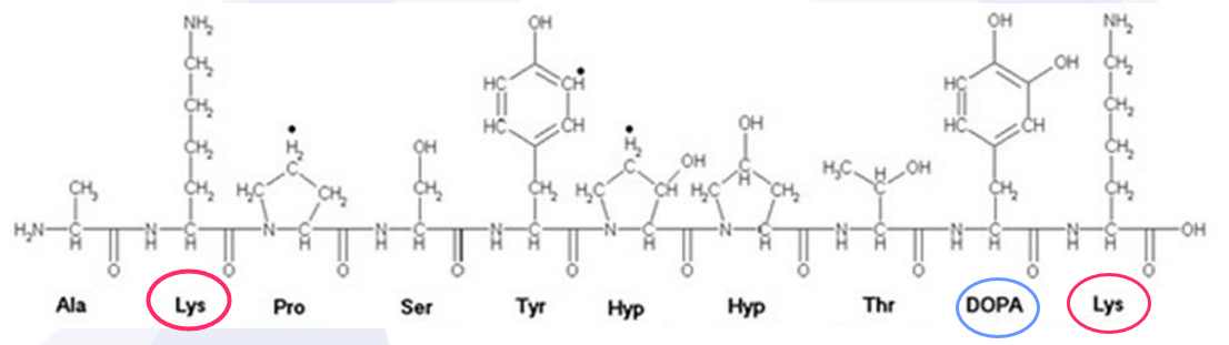貽貝粘蛋白有70-90個(gè)重復(fù)的多肽片段組成,每個(gè)多肽段由10個(gè)氨基酸組成,其中2個(gè)是賴氨酸(Lys)。這使得蛋白具有較高的等電點(diǎn),在人體生理pH值下帶有很強(qiáng)的正電荷。每個(gè)貽貝粘蛋白分子帶150以上正電荷,而人體的各種細(xì)胞均帶負(fù)電荷。通過(guò)帶正電荷的賴氨酸吸引人體帶負(fù)電荷的細(xì)胞,且對(duì)細(xì)胞不具有選擇性,對(duì)表皮細(xì)胞、成纖維細(xì)胞、血管內(nèi)皮細(xì)胞、神經(jīng)細(xì)胞等促進(jìn)貼壁和爬行替代,多維度加速愈合。