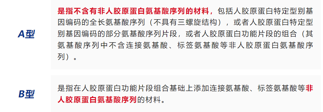 國家藥監(jiān)局醫(yī)療器械標(biāo)準(zhǔn)管理中心發(fā)布《重組膠原蛋白生物材料命名指導(dǎo)原則》解讀,根據(jù)其是否含有非人膠原蛋白氨基酸序列,將重組人源化膠原蛋白分為A型和B型兩種類型。