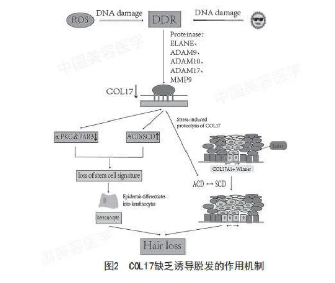 近些年來(lái)有研究表明脫發(fā)與XVII型膠原蛋白的缺失有關(guān),COL17水解可引起毛囊微型化最終導(dǎo)致脫發(fā)。