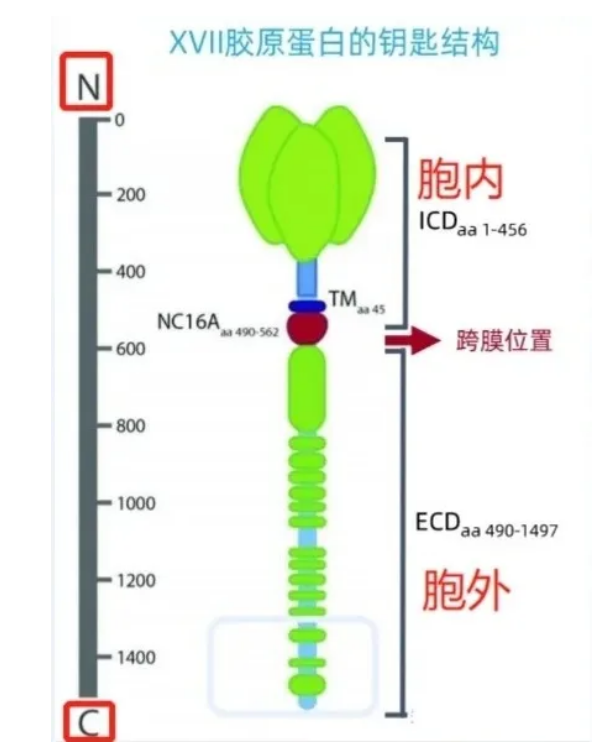 XVII型膠原蛋白,又稱COL17,作為一種跨膜糖蛋白,是表皮干細(xì)胞半橋粒的重要組成成分,主要位于毛囊球部的毛囊干細(xì)胞以及表皮和真皮連接處的表皮干細(xì)胞(ESC)中,其作用是使得表皮和真皮通過(guò)基底膜帶緊密連接,以促進(jìn)表皮更替,穩(wěn)固基底膜。