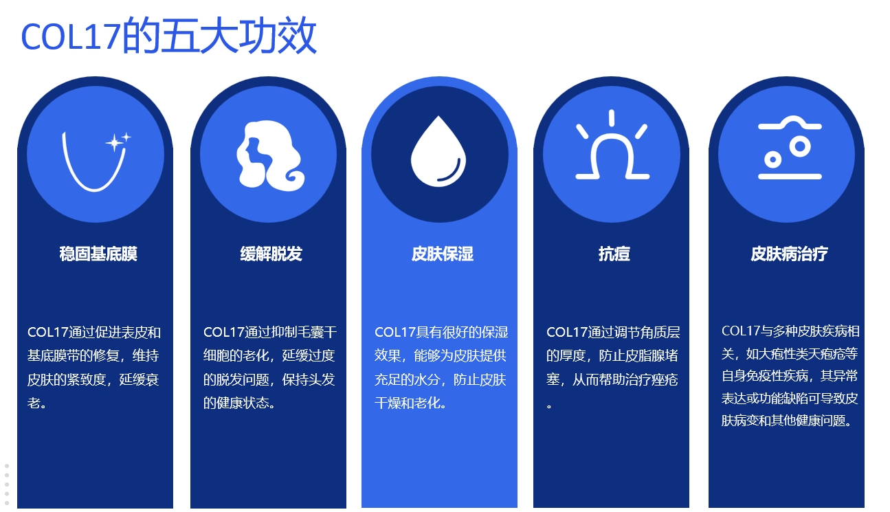 XVII型膠原蛋白是表皮基底層的一種跨膜蛋白,具有維持表皮真皮之間的緊密連接,以促進(jìn)表皮更替、穩(wěn)固基底膜的功能, 從基底膜帶上實(shí)現(xiàn)抗衰修復(fù)。已有證據(jù)表明,COL17水解可引起毛囊微型化最終導(dǎo)致脫發(fā)。COL17因其特有的生理功能,在延緩治療脫發(fā)有很好的應(yīng)用前景。