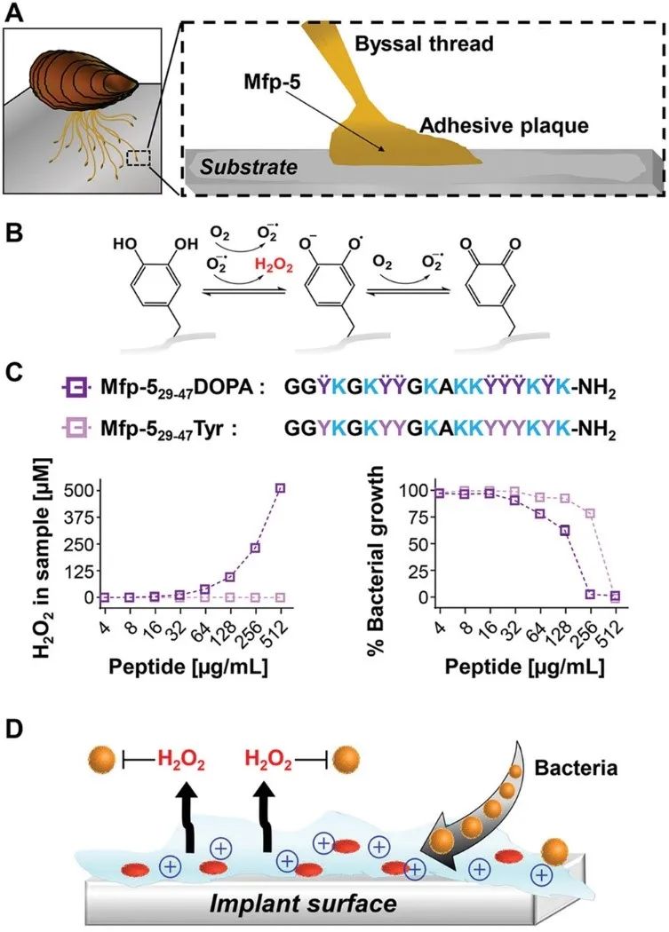 通過與酪氨酸取代DOPA殘基的Map-5 29-47 Tyr肽進(jìn)行對比,發(fā)現(xiàn)多巴殘基是產(chǎn)生過氧化氫的必要條件。Map-5 29-47 DOPA對革蘭氏陽性耐甲氧西林金黃色葡萄球菌(MRSA)顯示出抗菌活性,最小抑制濃度(MIC)為250 μg/mL。不含DOPA殘基的Map-5 29-47 Tyr肽也對MRSA顯示出一定的抗菌活性,表明賴氨酸也有助于增強(qiáng)抗菌活性。結(jié)果表明,天然Map-5衍生肽通過DOPA介導(dǎo)的H2O2產(chǎn)生和賴氨酸殘基的裂解潛力表現(xiàn)出抗菌活性。