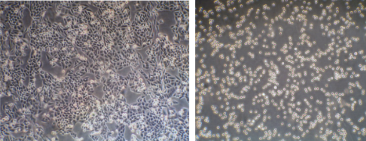 圖1?貼壁細(xì)胞消化前(左)和消化后(右)
