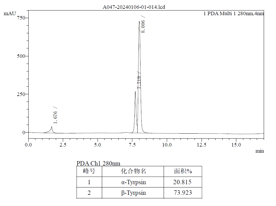 結(jié)論:HPLC結(jié)果分析,β-Trypsin的HPLC含量可達(dá)70%以上,符合2020版中國(guó)藥典標(biāo)準(zhǔn)。