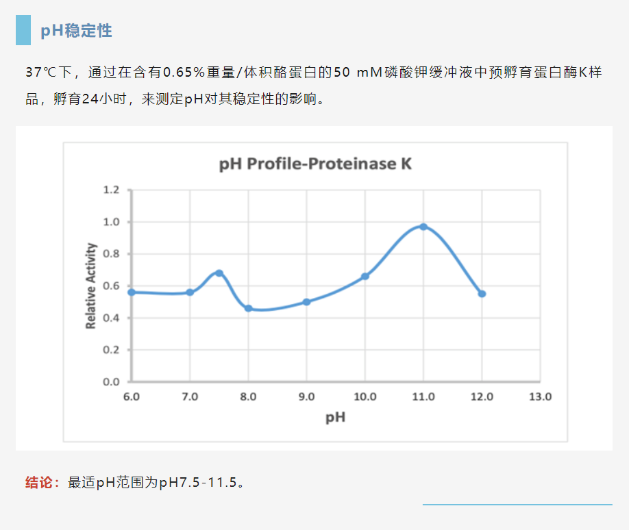 蛋白酶K(Proteinase K)是從真菌林伯氏白色念球菌中分離出的高活性絲氨酸蛋白酶,是現(xiàn)有蛋白酶中活性較高的品種,pH活性范圍為4-12,溫度范圍達(dá)0-75℃,甚至在SDS、尿素或EDTA存在的情況下依舊保持活性。它切割脂肪族氨基酸和芳香族氨基酸的羧基端肽鍵,可以降解所有蛋白質(zhì)。