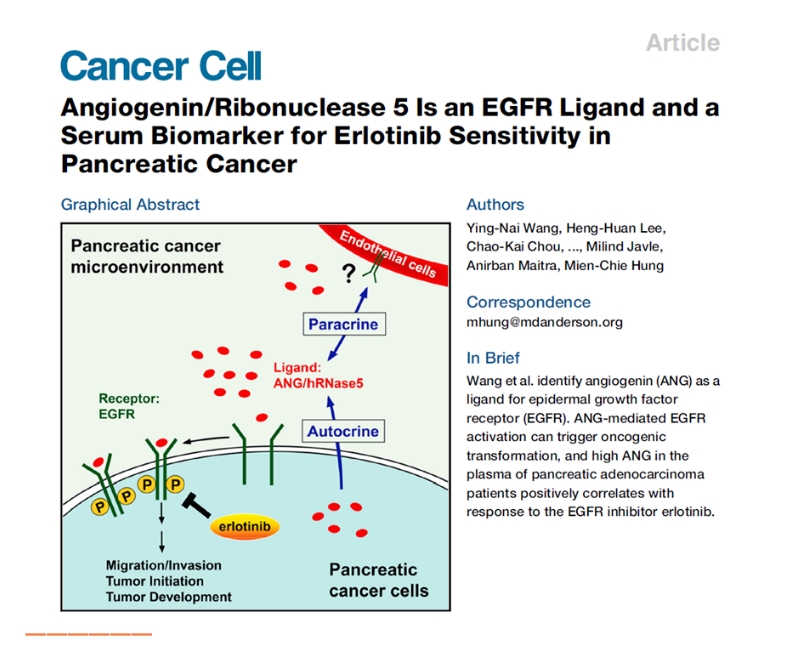 [2] WANG, YING-NAI, LEE, HENG-HUAN, CHOU, CHAO-KAI, et al. Angiogenin/Ribonuclease 5 Is an EGFR Ligand and a Serum Biomarker for Erlotinib Sensitivity in Pancreatic Cancer[J]. Cancer Cell,2018,33(4):752-769. DOI:10.1016/j.ccell.2018.02.012.
