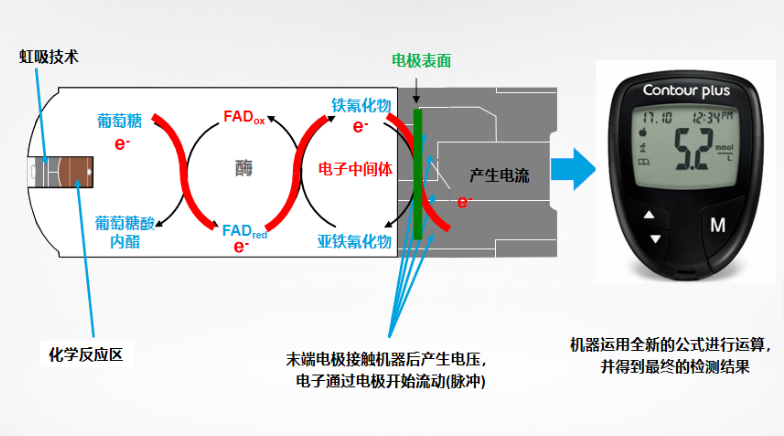 如今主流血糖監(jiān)測是從指尖采血后通過電化學法測量血樣中的葡萄糖與試紙酶和介質發(fā)生的葡萄糖氧化還原反應而產生的電子,即電流,儀器經過精密計算最終將電流值轉換為血糖讀數。